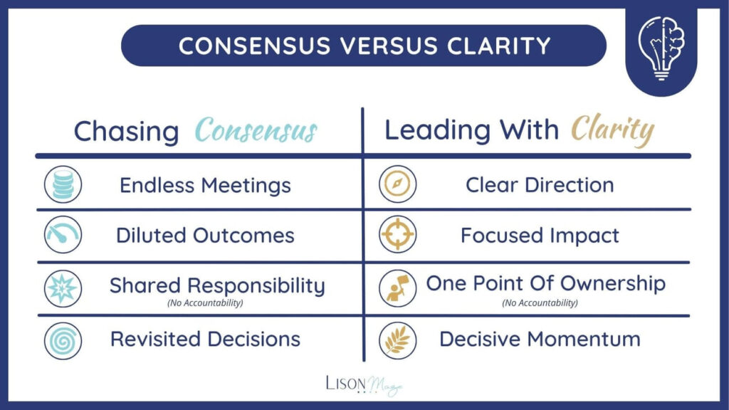 Leadership means listening to input but being clear about who owns the decision. When a leader says, “This is my decision, informed by your input,” it creates two things that consensus rarely provides: clarity of direction and clarity of responsibility. The team knows what’s happening next and who is making it happen.