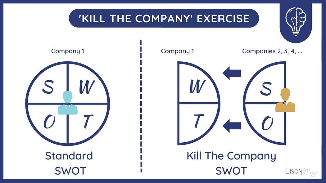 With a new starting point, “Kill The Company” exercise vividly shows the risk of not doing anything (while your competitors are on the move). Suddenly, the cost of inaction appears far greater than the one of doing something and being unsuccessful because the former can literally put you out of business.